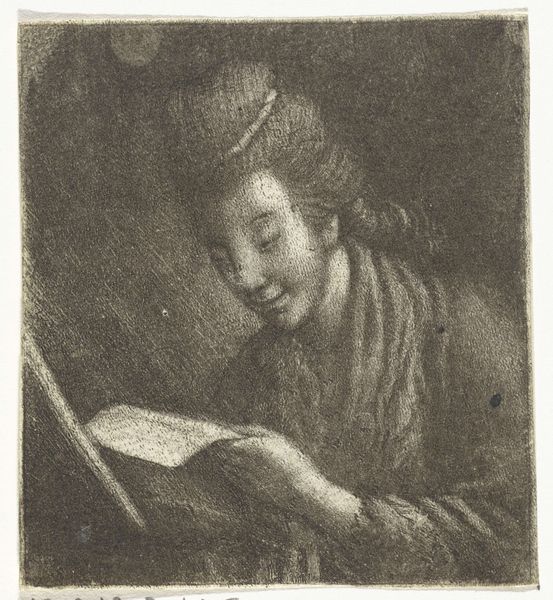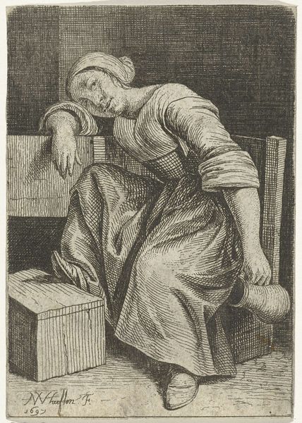 Editor: So, here we have "Slapend meisje aan tafel," or "Sleeping girl at a table," an etching by Caspar Jacobsz Philips from the late 18th century. It looks like the girl is absolutely exhausted; she is slumped on a table! I wonder what story we can read from this scene. What strikes you most when you look at this etching? Curator: It has a peculiar feeling, doesn’t it? As if the girl has drifted off mid-task, perhaps a spot of needlework abandoned in her lap. I imagine the scratching of Philips' etching tool mirroring the sound of restless thoughts just before sleep. The rough cross-hatching feels like the very texture of exhaustion. Have you ever felt like that, where even the shadows seem heavy? Editor: Absolutely! The cross-hatching almost vibrates. Tell me, what was Philips trying to capture beyond just a girl asleep? Curator: Maybe a stolen moment. In those days, sleep wasn't always a refuge but a pause within a rigid social structure. This image has always felt… private. Look at the chair – almost skeletal in its simplicity, but still solid. To me, it hints at the quiet strength of women in domestic roles, the unspoken narratives within everyday life. Isn't it funny how much a simple etching can whisper? Editor: It is. Now, I’m seeing less 'tired' and more 'resilient'. Thanks to your thoughts about women’s role, it resonates differently. Curator: That’s the beautiful part, isn't it? A work of art transforms with each new perspective. Who knows, maybe tomorrow we'll see something entirely new again.