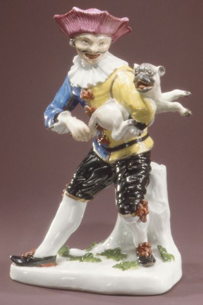 Curator: This delicate piece, crafted sometime between 1765 and 1780, comes from the Fulda Pottery and Porcelain Manufactory. Titled "Gardener," it's rendered in ceramic—specifically, porcelain—and can be found here at the Metropolitan Museum of Art. Editor: He looks so weary! I immediately see class divisions in play here. The somewhat comical, drooping pose hints at the realities of labor, set against a decorative, Rococo style seemingly detached from such concerns. Curator: Exactly. Porcelain production during this period demanded intense labor. The Gardener here is posed as a picturesque subject, while obscuring the intense effort required to produce both the object he holds and the figurine itself. Editor: We must consider who would've commissioned a piece like this. Clearly someone wealthy enough to not engage in such manual labor, further establishing those societal lines. Curator: Yes, porcelain at that time represented a fusion of skilled artistry, alchemic processes, and industrial systems—transforming base materials into prized possessions. This specific type of decorative art highlights its connection with the economy. Editor: Look, even his clothing—the pink coat and flowered hat—seem a performative costume of work, lacking any grit. He is not a real gardener, but an idea *of* a gardener that is safe for display in aristocratic settings. Curator: It definitely presents a sanitized version of labour. The pedestal, made of the same porcelain, places him into a permanent performance space. Every detail reflects status. Editor: I do also find his downcast expression to be a source of pity and humanity that suggests at least an ambivalence on the part of the artist. Maybe there’s room for some working-class empathy here. Curator: An interesting thought—it’s clear though, to me, that the figure stands as a physical embodiment of commodity production from the 1700s: delicate and precious on the surface but steeped in complex relations of material and making. Editor: Well, it's definitely a reminder to see past the object and ask, 'Who made this, under what conditions, and for whom?'. This transforms how we relate to its surface appeal and its beauty.