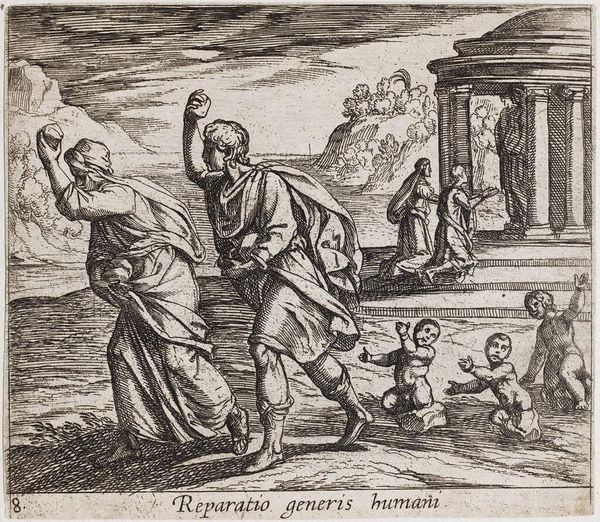 This engraving by Dirck Volckertsz Coornhert, made in the 16th century, presents a complex allegorical scene rendered in meticulous detail. The composition is divided into distinct groupings, each contributing to the overall theme of hypocrisy supplanting virtue. Note how Coornhert uses the stark contrast between light and shadow to define forms and create depth. The figures are carefully arranged within the landscape, directing the viewer's eye across the narrative. The central figure embodies hypocrisy, laden with symbolic objects that betray her true nature. On her shoulder sits a monkey, a signifier of deceit. Observe the contrast between her pious appearance and the duplicitous symbols she carries. The allegorical scene isn't just a moral statement, it's an unpacking of how society itself is structured. The visual language employed by Coornhert invites us to question the surface appearances of piety and virtue, urging us to look deeper into the underlying realities of human behavior. In its play of light and shadow, the artwork challenges fixed meanings and asks us to decode the subtle signs of deception.