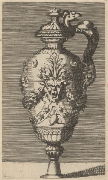 Curator: Before us is "Gutternium," an engraving dating back to 1563 and currently residing here at the Rijksmuseum. The artist is Johannes of Lucas van Doetechum. Editor: My immediate impression is… elaborate! A sort of playful grotesquerie rendered with extraordinary detail. What material might such a vessel be made from? Curator: The print medium somewhat belies its potential materials; it could be any base metal, perhaps even silver. But I find the Mannerist style dominating. The interplay between figuration and form is intriguing – note the sinuous curves, the almost overwhelming ornamentation. The composition spirals upwards, demanding that the eye travel continuously. Editor: I'm struck by the implied labor – the sheer skill and time required to both design and execute such an intricate object. Engraving this alone must have been a demanding exercise! And the social context, I wonder who owned such things? Were they displayed, or actually used? That serpent-shaped spout can’t be practical! Curator: It pushes the boundaries of practicality, certainly! The artist masterfully subverts utilitarian design, emphasizing artifice over pure function. I am reminded that in the Mannerist aesthetic, objects become vehicles for intellectual play and demonstrations of virtuosity, reflecting a certain detachment from material concerns. Editor: Still, to consider the workshop…the casting, the chasing, and polishing of the metal. Also, the collaborative aspects of design between artist, workshop, and patron interest me most. We get lost too easily, I think, focusing solely on an individual ‘genius.’ The evidence suggests a team, with a highly refined manufacturing process. Curator: Your focus on the social sphere of craft sheds an insightful light on artistic production! Perhaps "Gutternium" does not merely reflect artistic indulgence, but also an elaborate choreography of labor and skill. Editor: And it's a good reminder that behind every complex artwork, there are human stories waiting to be uncovered. Curator: Indeed! Leaving one pondering, what untold meanings may still be poured forth from “Gutternium?"