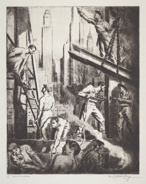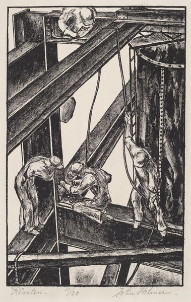 Editor: Rosalie Rush created this woodcut, "Untitled (Street Game)," sometime between 1935 and 1943. The stark contrast really emphasizes the children's activity, but it feels a little ominous, like they are trapped in this rough-hewn space. How do you interpret this work? Curator: This piece resonates deeply with the visual language of social realism and its political undercurrents. Look closely at the scene. It seems to depict a game, but the woodcut medium and stark composition bring forth a sense of confinement, maybe even desperation. Considering the historical context, the work possibly reflects the struggles of marginalized communities during that period. What stories do you think the artist is trying to tell about childhood and community? Editor: I see what you mean. The children's game doesn't feel entirely carefree. It also reminds me of works associated with the Black Arts Movement, expressing a similar concern about societal injustice. Do you think the Black Arts Movement might be in conversation with the Social Realism in this print? Curator: Absolutely. Artists of the Black Arts Movement built upon the foundations laid by social realists. They channeled art as a powerful tool for social change, challenging dominant narratives and reclaiming agency. Rush’s focus on the activity of these children makes me wonder about ideas related to the “double consciousness," and the negotiation of identity within oppressive structures. How does understanding that context affect your view of the artwork? Editor: That adds a whole other layer. Now I'm seeing the children not just playing, but maybe practicing resilience, creating their own world within a limited space. Thanks, it completely shifted how I see the print. Curator: It is an example of how art acts as a cultural mirror reflecting both historical struggles and persistent aspirations for change.