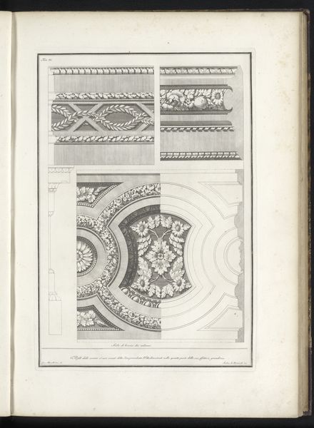 Charles Pierre Joseph Normand made this print of ceiling designs sometime between the late 18th and early 19th centuries, using etching or engraving. These are relatively accessible printmaking methods. The materials used are modest: a copper plate, some acid, ink, and paper. What is interesting is the relationship between this humble process and the image it creates. We see three ornate, neoclassical ceiling designs which would have been executed in plaster by highly skilled artisans. Each design features a central medallion surrounded by geometric and floral motifs, demanding considerable labor to produce in three dimensions. Prints like this one helped disseminate artistic ideas, connecting the world of design with the skilled labor required to bring those ideas to life. This reminds us that even the most rarefied expressions of taste are dependent on a network of makers. The final form blurs the distinction between art and craft.