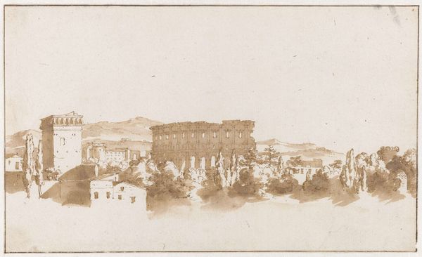 Editor: So, this is "The Temple of the Sibyl at Tivoli" by Jacob van der Ulft, made sometime between 1637 and 1689 using watercolor and pencil on paper. It’s all in these lovely sepia tones... I'm immediately drawn to how serene and almost dreamlike the scene feels. What details stand out to you? Curator: Dreamlike is spot on! The temple perched there, like a forgotten thought. Van der Ulft wasn't just drawing a building, he was conjuring a feeling. Notice how the washes of color create depth. Makes me wonder, doesn’t it, about time, memory, and the way landscapes hold our stories. The subdued palette only intensifies this, creating a palpable sense of stillness. Have you ever felt a landscape calling you back in time like that? Editor: Absolutely, it’s like the air itself is heavy with history. The temple looks so solid, and yet the rendering is so delicate. What was Tivoli like during this period? Was it a popular subject for artists? Curator: Oh, Tivoli was *the* must-see spot for artists and Grand Tourists! Van der Ulft, though, brings his unique sensibility to it. While others focused on grand vistas, he zooms in on this almost intimate corner. I imagine him sketching this, maybe on a cloudy day, really sinking into that atmosphere. And that temple, with its circular shape, evokes a sense of the eternal, doesn’t it? Editor: Definitely. It's given me a fresh appreciation for landscape drawing, almost like a portal to another time. Curator: Exactly! Art lets us become time travelers, even with just some pencil, paper and dreams! It also underscores that landscape isn’t just physical space; it’s psychological space too.