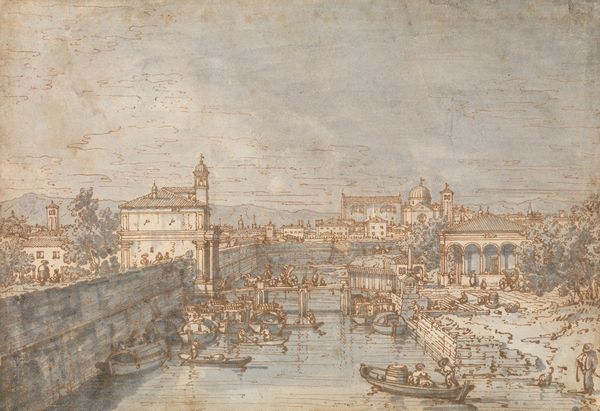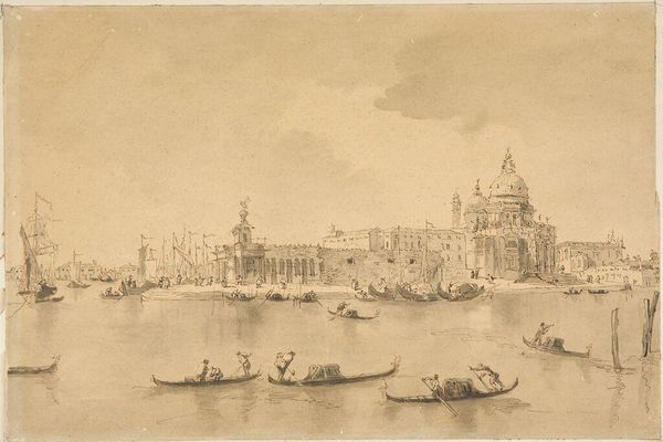 Francesco Guardi painted "Venice: The Dogana and Santa Maria della Salute" in oil on canvas. The pale light and fluid brushstrokes create a sense of airy spaciousness, softening the architectural forms of Venice. Guardi uses a high horizon line, which flattens the composition and emphasizes surface patterns. Notice the reflections on the water, rendered with loose, flickering strokes. These create a shimmering effect and a sense of movement. The texture and layering of the paint is particularly evident here. The painting's structure is a network of intersecting lines and planes. This network destabilizes any fixed perspective, encouraging a more fragmented reading of the scene. This challenges the traditional picturesque view of Venice by focusing on atmospheric effects and the dynamic interplay of light and shadow. It is in these formal qualities that the true subject of the painting lies.
