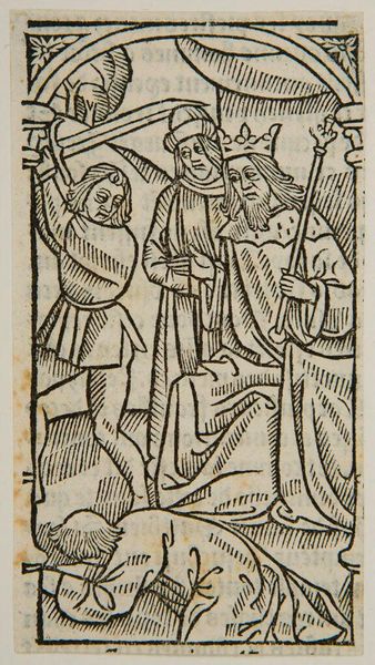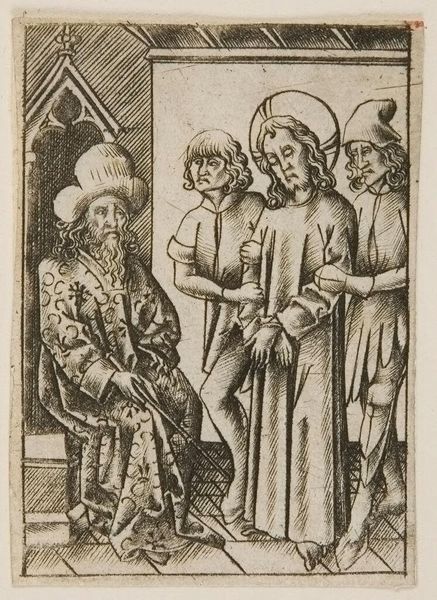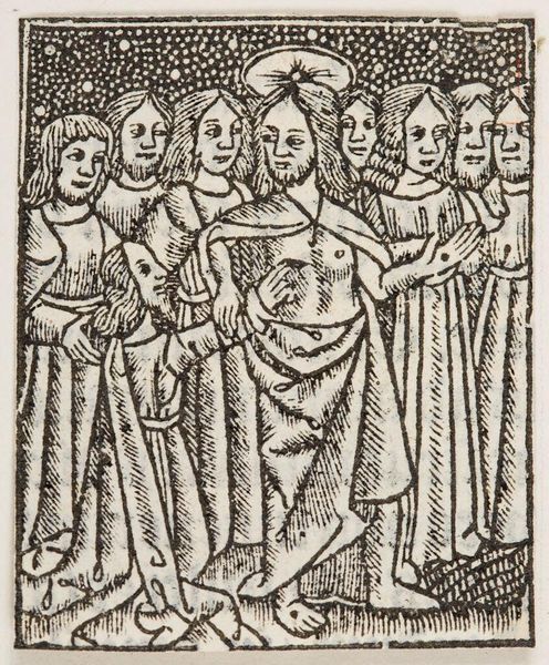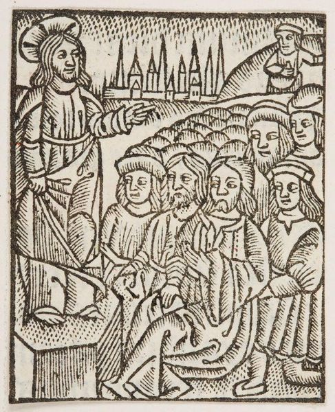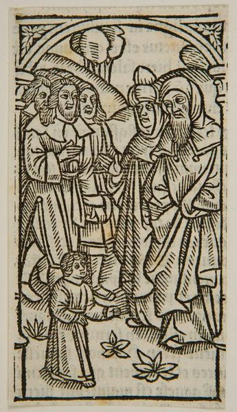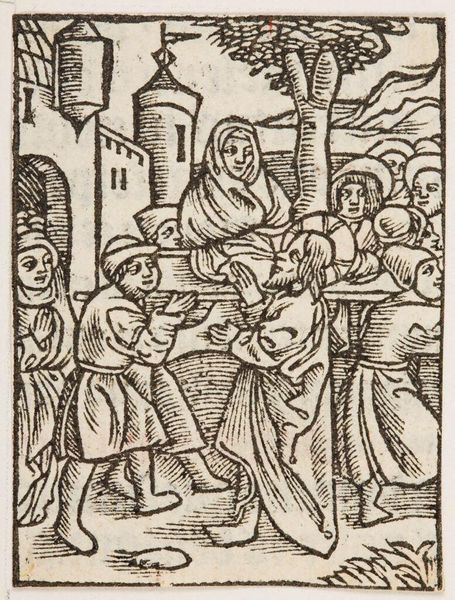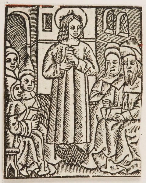 Curator: This woodcut, held at the Harvard Art Museums, is titled "The Request of the Mother of James and John" and is by an anonymous artist. Editor: Immediately, I'm struck by its stark, almost severe quality. The figures are stiff, yet there's a strange intimacy in the mother’s request. Curator: It depicts a biblical scene where the mother asks Jesus to grant her sons positions of power in his kingdom. The small scale and the use of woodcut suggest it was likely produced for wider circulation. Editor: The rigid social hierarchy is obvious here. It’s hard not to think about the power dynamics at play, even maternal ones, and who benefits from such a request. Curator: It reflects the social norms of the time, where requests to figures in power were common. Editor: Seeing it through our contemporary lens really exposes the inequalities, doesn't it? Curator: Indeed, and it shows us how deeply these power structures are embedded in our history. Editor: Food for thought about the legacies we still grapple with.