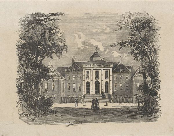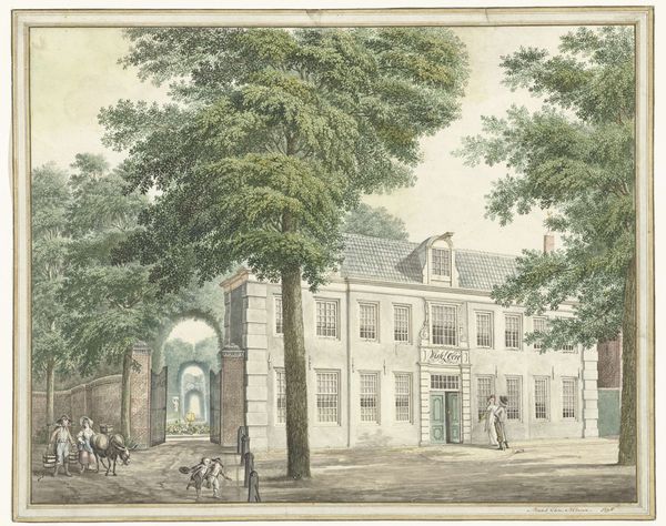 Curator: This serene composition before us, titled "Gartenanlage mit Taxushecke und einem Haus zwischen zwei Bäumen," or "Garden with Yew Hedge and a House Between Two Trees," comes to us from Isaac de Moucheron, a name synonymous with Dutch Golden Age landscapes. This drawing, realized in ink and watercolor on paper, exemplifies his skill in rendering architectural scenes with a painterly touch. Editor: Immediately, I’m struck by the tranquility. It's like a still moment lifted from a dream, or maybe one of those lovely stage sets where you just *know* something delightful is about to happen. The house, almost doll-like in its precision, is so perfectly framed by those feathery trees. It has this otherworldly serenity, really. Curator: The artwork resonates deeply within the context of 17th-century Dutch society. Moucheron and his contemporaries navigated a complex socio-political landscape shaped by burgeoning global trade, wealth accumulation, and intense social stratification. Drawings like this reveal more than aesthetic choices; they act as visual testaments to societal structures, articulating the ideals of harmony and order valued by the wealthy merchant class. Editor: It feels very contained, doesn't it? You know, I bet that if you actually lived there, reality might burst the bubble—but as a concept, as an ideal, it’s gorgeous. It almost feels like it’s critiquing that wealthy lifestyle too. A gilded cage maybe? What does it even *mean* to live a life so carefully constructed, so devoid of wildness? Curator: That’s insightful. Considering that Dutch Golden Age art was, in some ways, a project of nation-building and self-representation, the precise architecture could represent order. It may also reference the political stability after achieving independence. Furthermore, gardens at the time could be understood through gendered perspectives: While men exercised political authority outdoors, women often exerted their influence within the controlled, “domestic” space of the house and garden. Editor: Ah, that resonates! It adds another layer of complexity to the piece, because it transforms it into this little stage on which all kinds of unspoken dramas unfold. I am also curious about those yew hedges which become geometric shapes that suggest control and confinement. I think Moucheron captured something far beyond a pretty picture here. Curator: Precisely. It becomes a tableau where we observe and participate in a complex interrogation of privilege, gender roles, and societal control during the Dutch Golden Age. I thank you for helping us highlight the critical complexities within de Moucheron's tranquil, yet incisive, landscape! Editor: Absolutely! It's the sort of piece that rewards you with a new layer of understanding each time you gaze upon it. That's when you know you're truly connecting with a piece of art.