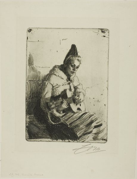 Felicien Rops made this etching, entitled 'The Drinker', sometime in the late 19th century. An etching is made by drawing into a waxy ground on a metal plate, which is then bathed in acid. The acid bites away the exposed lines, which are then inked and printed. The real subject of this artwork is not so much the drinking man, but the etched line itself. The artist has used hatching and cross-hatching, varying the density and direction of the lines, to create areas of light and shadow, volume and texture. Look closely, and you will see how the lines are used to describe the folds of the man's clothing, the feathers in his cap, and the rough surface of the jug. Rops was a master of this technique, and he used it to create a sense of depth and detail. The controlled, intentional marks speak to the intense labor and precision involved in producing this work. Appreciating the skill of etching invites us to consider how materials, process, and context intertwine to shape meaning in art.