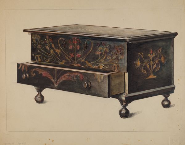 Betty Jean Davis made this Pa. German Chest sometime between 1855 and 1995, and it looks like it was made with watercolour on paper. There's something so intimate about the way the image is put together, almost like you're right there in the maker's space. Look at how Davis builds up the surface with gentle layers of color. The paint isn't trying to hide anything. You can almost feel the texture of the wood, the slight variations in tone, and the hand-painted motifs. Then there are these amazing details, like the inscription in the middle panel surrounded by a heart. It's not perfect, but that’s what makes it so appealing. The little imperfections and the obvious signs of handcrafting let you know a person was involved, and I love that. This reminds me a lot of other painters working today like, say, Chris Ofili, because the work’s impact comes from the artist’s relationship with material and process, reminding us that art is a conversation across time.