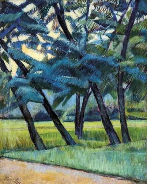 Editor: So this is Erich Heckel’s "Park Landscape," painted in 1910. It's an oil painting. What strikes me is how unnatural the colors feel for a landscape. It's almost jarring, but in an exciting way. What do you see in this piece? Curator: I see a landscape re-imagined. Look at how Heckel uses color not to replicate nature, but to evoke an emotional response. The fiery reds under the trees juxtaposed with cool blues speaks to the Expressionist movement's interest in internal feeling made visible. The bridge in the background: does it feel inviting? Editor: Not really. It's... cold almost? Stark against all those vibrant greens and blues. Curator: Exactly. Bridges are traditionally symbols of connection and passage. But here, it appears rigid, perhaps even suggesting a barrier. Heckel distorts natural forms to depict a landscape that isn't necessarily inviting. Does the brushwork reinforce that tension for you? Editor: It does. The strokes are rough and choppy. Nothing is blended or smooth. So, even a traditional image like a park landscape carries the weight of psychological turmoil? Curator: Precisely. What appears to be a pleasant park scene transforms into something much more psychologically complex, reflecting the anxiety of the era. These vibrant and unsettling colors express an emotional intensity. Think of fauvism too and its visual energy. Editor: So, beyond just depicting trees and a bridge, Heckel's using symbols and color to represent something deeper than just the surface image? Curator: Indeed. We find him transforming external reality into an exploration of internal emotional landscapes, turning a simple walk in the park into an introspection of human feeling in the modern world. Editor: That really reframes how I see it now. I was focused on the color but missed the underlying symbolism! Thanks!