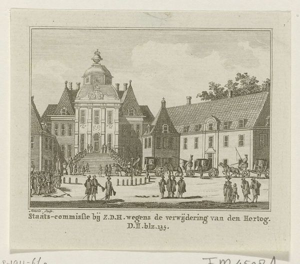 Curator: What initially grabs me is how Bellotto, with such disciplined lines in this print, still evokes such a breathable space—you can almost feel the Neumarkt bustle in 1750. It’s named “Neumarkt met de Frauenkirche te Dresden.” Editor: The density of it strikes me—a real sense of layered labour. Etching and engraving must have taken forever; the physical act of making this reflects the city’s own layered construction. All the processes required, from manufacturing the paper to distributing the final print—fascinating. Curator: Yes! It makes you think about place in a completely different way—what goes into manufacturing location, culture! Bellotto definitely captures something… that pre-industrial hum, a sort of collective endeavor memorialized. The way he frames the Frauenkirche is very deliberate too, almost like it’s watching over the market square. Editor: Well, it would have loomed large in people’s lives – in Baroque culture more generally. Buildings as power, architecture speaking for social stratification…even this print acts as a little piece of portable capital. Prints like these were a means to commodify the urban experience. Curator: Absolutely, and look at the composition - how everything seems to lead to it, this church is at the core of city's material and spiritual ambitions. But it's also this idea of an idyllic landscape—something so romanticized for a time and space inevitably tied to political and economic grit. Editor: Right! Each scratch mark is not only labour—but a choice reflecting value! Consider access – owning art meant owning power… Who could afford prints and who could afford to shape policy around architectural production. We have to be very materialist to approach Bellotto today! Curator: That is true. Makes you reconsider what seeing – or buying – a view really meant. What world they are constructing with ink! Thanks, this one always feels rich with possibility when you stop to look. Editor: Agreed. Never fails to show the tangible and social threads.