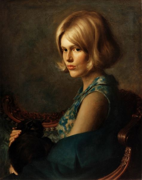 Editor: Here we have Rose Freymuth-Frazier’s "Duchess With Duke" from 2013, an oil painting. I'm immediately struck by its almost classical feel, but with a modern sensibility. The subjects are rendered with such care, the cool palette offset by her red lips and the green in the background, that it’s almost startling. What's your interpretation? Curator: What a compelling portrait! Let’s consider the title for a moment – “Duchess With Duke”. How does the implied social hierarchy play out visually? Does it reinforce existing power dynamics or perhaps subvert them in some way? Editor: I hadn't considered it like that! It seems pretty straightforward—a portrait of a well-to-do woman with her pet. But now that you mention it, is the artist trying to comment on the elite? The woman looks like she’s cosplaying a rich lady! Curator: Exactly. The "duchess," with her carefully styled hair and bold lipstick, is holding a pampered dog—her duke. Does this depiction offer a critique of class and the construction of identity, particularly through consumerism and performance? Also, how might the historical context of portraiture—traditionally a genre for the wealthy—impact our understanding of this piece? Editor: So you are saying, the artist is perhaps using portraiture to make a social statement? She’s using this classical, established genre to comment on our modern ideas of class? It makes the painting more poignant. Curator: Precisely! And how are those conventions being reinforced or challenged? Consider the contemporary moment. We have inherited certain power dynamics. Editor: That’s such an interesting way to look at it; I always focused on purely visual aspects, and missed the whole picture, haha! Curator: Well, art is, after all, a product of its time!