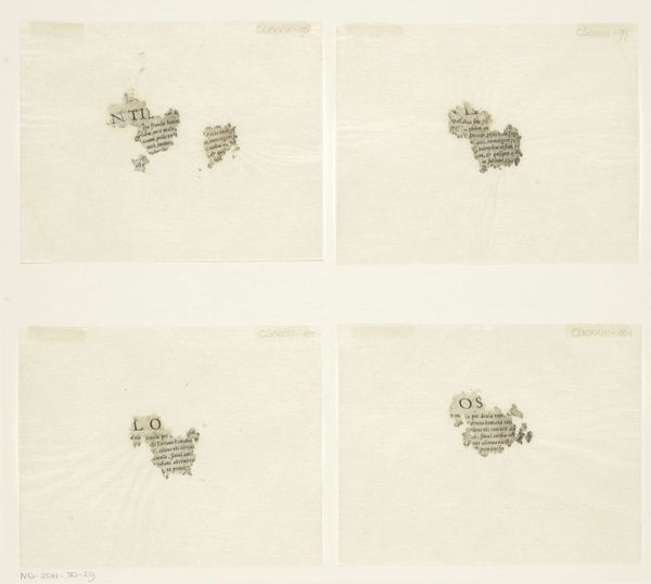 This work, ‘Losse fragmenten van een prent van het tafereel van Cebes’ by Philips Galle, was created around the late 16th century. Here we see several fragments of a larger scene, each isolated on its own small, framed field. The monochromatic medium emphasizes the intricate lines and textures, drawing us into the delicate details within each fragment. The composition invites a semiotic reading. Galle presents us with pieces of a puzzle, prompting questions about the original image and its intended message. This fragmentation raises interesting ideas about memory, meaning, and the reconstruction of history. Each piece, with its unique arrangement of lines and shading, acts as a signifier pointing to a larger, lost narrative. Consider how Galle's choice to isolate these fragments challenges our understanding of wholeness and coherence. By presenting only parts, the work compels us to engage actively in interpreting and reassembling the narrative. This echoes contemporary theories about the instability of meaning and the role of the viewer in constructing understanding.