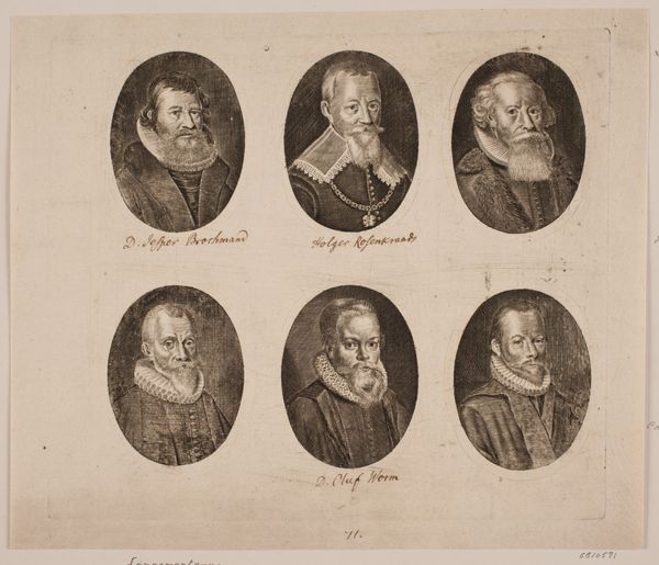Curator: Welcome. Let's turn our attention to a drawing here at the Rijksmuseum entitled "Portraits of Constantijn Huygens and his five children." It was rendered sometime between 1817 and 1818. Editor: The arrangement of figures inside these ornamented ovals gives a first impression of a rather stern family crest. Though skillfully drawn in pencil, its monotone palette strikes me as a very somber affair. Curator: The technical skill on display is noteworthy. Look at the intricate detail achieved with simple pencil strokes. This wasn't just about depicting likeness; it speaks to the emerging commercial availability of refined drawing implements during that period. How did access to better pencils affect the professional and amateur artistic practice? How did the availability affect who could commission a portrait? Editor: Right, and focusing on the symbolic framework, notice how Constantijn Huygens, the father, is positioned centrally, acting as the linchpin holding this family unit together, quite literally visually. The oval frames around each figure are also interesting: they give the impression of gemstones, as if to associate this group with something priceless. Curator: Precisely, these material choices affect perception. Pencil, paper, the very reproducibility of a drawing—these elements challenge the grand tradition of painted portraiture. Also, what does it suggest that this piece, even as a historical recreation from the 19th century, mimics some elements of earlier production? Consider too how the industrial processing needed to manufacture these tools affects who can produce works such as this one. Editor: Yes! And the text below adds another layer. "Ecce haereditas Domini. Anno 1647," It directly translates to "Behold the inheritance of the Lord," a biblical reference, taken from Psalms 127:3, connecting progeny and generational continuity. Each child in turn is framed and almost revered within the overarching circular tableau. It is both portrait and emblem. Curator: Fascinating when you approach it from that angle. For me, this is about more than that biblical quotation. The drawing’s existence reflects a shift toward new means of pictorial expression, a symptom of industrialized supply chains beginning to impact modes of making. Editor: It’s an interesting exchange of form and matter, one can see. Curator: Exactly, each layer unveiling a complex web.