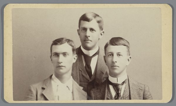 Albert Greiner created this photographic print titled “Portret van drie jongens” sometime in the late 19th century. This portrait, now held at the Rijksmuseum, offers a fascinating glimpse into the social conventions of the era. In the late 1800s, photography was becoming increasingly accessible, yet formal portraits remained a significant marker of social status. The three boys, stiffly posed and formally dressed in dark suits, reflect the rigid codes of conduct and the importance placed on outward appearances in bourgeois society. Consider the setting: a studio, likely, with props such as the ornate chair and column adding an air of sophistication and permanence. What does this image tell us about family dynamics, social mobility, or the aspirations of the middle class in the Netherlands at this time? To answer these questions, one might explore the history of photography, etiquette manuals, and other visual and written sources that reveal the values and norms of the day. Ultimately, it's in these layers of historical context that the photograph's deeper meanings emerge.