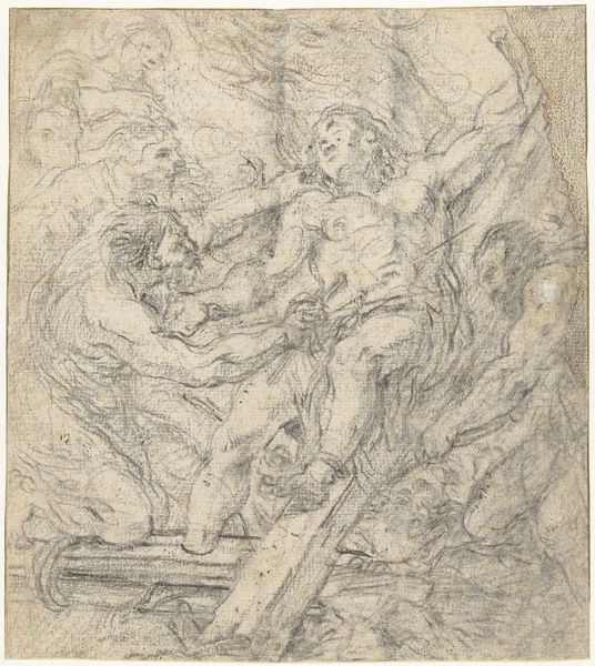 This is Gerard ter Borch the Elder's "The Resurrection of Christ", made using pen in brown, brush in gray and black ink on paper. The composition is striking. Borch uses dynamic, swirling lines to depict the chaos and awe of the resurrection. Figures are crammed into the lower half of the picture, in dramatic poses with exaggerated expressions, creating a sense of turmoil. Above them, Christ rises ethereally, depicted with softer lines that contrast with the angular, sharp strokes of the soldiers below. This juxtaposition underscores the divine breaking through the earthly. Here, Borch isn't just illustrating a biblical event; he's exploring the very nature of transcendence. The use of stark tonal contrasts enhances the dramatic impact, drawing our eye upwards towards the light. Note how Borch uses line and tone to destabilize the conventional representation of space and form, challenging us to think about the unseen forces at play in this pivotal moment.