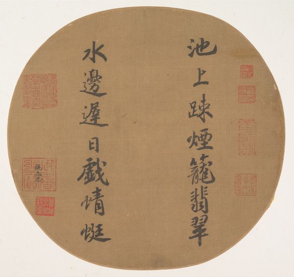 This is "Poem," made by Chen Yuansu in the late 16th or early 17th century. Executed in ink on paper, the fan's design immediately draws the eye to its semi-circular composition. The black ink calligraphy contrasts with the tan background, creating a striking visual rhythm. The poem's characters are not merely linguistic symbols; their arrangement and calligraphic style also function as visual elements. Notice how the characters vary in size and density. The interplay between the ink's darkness and the paper's lightness activates the pictorial space. This tension transforms the fan into a field of dynamic contrasts and invites us to consider the relationship between text and image, language and form. Ultimately, this fan destabilizes the traditional boundaries between writing and art. It invites viewers to contemplate how calligraphy can exist not only as a means of communication but also as a profound aesthetic experience, thereby functioning as a philosophical statement about art itself.
