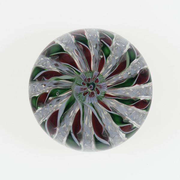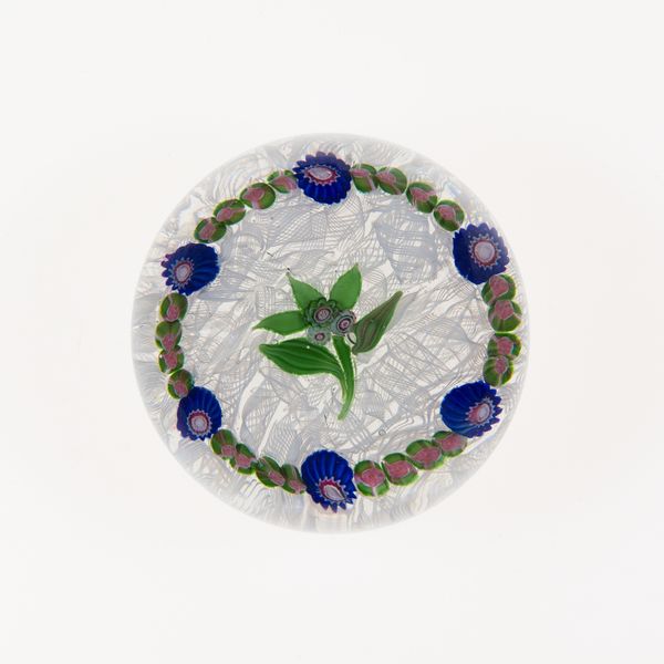 Curator: Welcome. Today, we’re looking at "Paperweight," a glass sculpture made by Compagnie de Saint Louis sometime between 1848 and 1855, currently residing at The Art Institute of Chicago. Editor: My first thought is of delicacy, an ephemeral moment perfectly preserved. There's something almost hauntingly beautiful about its miniature world held captive in glass. Curator: Yes, the visual impact is striking. Note how the spherical form acts as both container and lens, distorting and magnifying the meticulously arranged floral design. The interior arrangement employs strategies to create a dynamic interplay of light and form. Editor: Let’s not forget the material qualities of glass itself, how it is blown, manipulated and then cooled; the controlled fragility of that whole process, especially for an object meant to sit upon a desk and withstand the wear of everyday life. These paperweights were functional, but became symbols of craft in bourgeois life. Curator: I agree, the inherent tension between its practical function and refined craftsmanship generates intrigue. Consider also how the limited color palette--greens, browns, whites and a dash of cobalt blue--contribute to a unified yet subtly contrasted composition. Each color, each individual leaf and petal, plays a vital role in the overall aesthetic effect. Editor: What about the anonymous craftspeople? What can we say about the division of labour that was necessary to produce something this complex, this beautiful? Did these makers view it as art? Or labour? Curator: Fascinating point. Whether considered "art" or simply "production," these pieces reflect the broader cultural context of 19th century decorative arts and industrial manufacturing. The aesthetic complexity elevates what might otherwise be a purely functional object into something of considerable visual merit. Editor: Indeed. Examining it now, from our respective viewpoints, allows one to more appreciate the beauty that lies beneath its sleek, transparent surface. Curator: Absolutely. These crafted glass works from the past continue to teach us how aesthetic qualities transcend temporal boundaries.