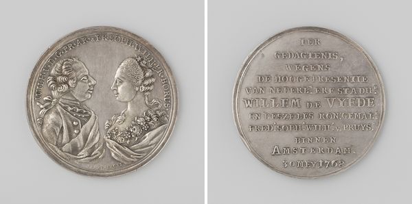 Curator: Let’s turn our attention to this engraving, "Eerste vrede van Parijs tussen Frankrijk en de geallieerden, ter ere van Karel Philip van Schwarzenberg en Clemens, prins Metternich,” created in 1814 by Franz Stuckhart. Editor: Its cool austerity really strikes me. The coldness of the metal, the formality of the portraits—it’s very calculated in its impact, wouldn’t you say? Curator: Absolutely. Commemorative objects like this served specific purposes, projecting power and solidifying historical narratives. It celebrates the Peace of Paris and, more importantly, the figures of Schwarzenberg and Metternich. Consider their roles as diplomats and military leaders—this isn't simply a work of art, it's political propaganda. Editor: I'm curious about the choice of metal as a medium. It speaks to permanence, doesn’t it? The engraver and workshop must have been focused on mass production, too, with implications for labor of the period. This wasn't about individual expression so much as reproducing imagery with an intended use-value and audience. Curator: Indeed. And we should unpack the visual language being employed here. Note the use of neoclassical portraiture—referencing ancient forms to align these figures with ideals of leadership and civilization. It suggests their actions are divinely sanctioned. Editor: Yes, there's an intentional visual connection being drawn to powerful symbols of historical movements and even myth. The engraving makes reference to these classical and Neoclassical influences in order to build and perpetuate a very specific idea about state power. I am drawn to consider the means through which that symbolism is spread. Curator: So when we look at something like this, we have to ask, whose narrative is being preserved and promoted? Who is included and, critically, who is excluded? It’s vital that we understand how artworks operate within power structures of their time. Editor: Exactly. Considering the object’s history allows us to examine the role of the artist as something of a technician—reproducing imagery for the sake of memorializing political figures through a certain material practice. Curator: Analyzing these dynamics offers insight into art's agency in shaping socio-political thought in 1814. Editor: Definitely food for thought about artistic intentions and wider applications. Thanks.