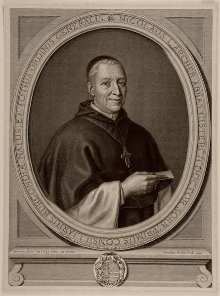 Editor: So, this is a rather striking engraving from between 1680 and 1725, titled "Portret van Gustavo Costa," made by Arnold van Westerhout. The detail is incredible for the time. What do you make of its cultural symbolism? Curator: Ah, yes, it's teeming with coded messages. Look closely at the subject's attire: the specific cut of the robe, the way the light catches the cross pendant. It speaks to the institutional power he embodies, the Catholic Church. But see the way his gaze meets ours? There's a directness there that hints at a reformer's zeal, a man invested in re-establishing an ideological hegemony during the Counter-Reformation. Note the text below...What does it signify to you? Editor: I'm assuming it describes his various titles and affiliations… sort of like an elaborate caption? Curator: Precisely! These honorifics function as visual cues that broadcast Gustavo Costa’s high status and significance in Neapolitan and Portuguese spheres. Think of the engraving not merely as a portrait but as a carefully constructed performance of identity meant to resonate across cultures. What of the artist’s signature on the lower left corner of the artwork? What message do you get from that? Editor: Interesting. You mean that this image might convey cultural nuances beyond its obvious religious context. It's fascinating to think about these details being intentionally included to shape how viewers at the time perceived Costa. Curator: Precisely! Understanding these codes unravels how cultural memory and identity were meticulously crafted and conveyed through images, even now. Editor: Wow, I hadn't considered all of that. I'll definitely look at art with a new perspective now, paying closer attention to those often overlooked details.