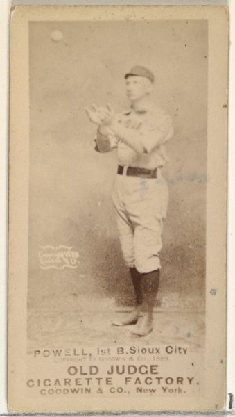 Editor: This is an 1888 photographic print titled "Rehse, Pitcher, Minneapolis, from the Old Judge series (N172) for Old Judge Cigarettes," created by Goodwin & Company. What strikes me is how this almost mundane photograph of a baseball player, in sepia tones, was actually made to advertise cigarettes! What is your perspective on this? Curator: I focus on how this piece exemplifies the entanglement of labor, material culture, and early consumerism. It’s fascinating to consider how the rise of baseball coincided with the mass production and aggressive marketing of cigarettes. The card itself is not simply a portrait; it's a commodity circulated to drive the consumption of another commodity. How does understanding this connection change your view of the work? Editor: It does shift my perspective! Seeing it as part of a system, rather than just a picture. It's mass produced and intentionally distributed; it transforms it into something completely different. Does the fact that it's considered art now alter that relationship at all? Curator: Absolutely. The recontextualization of this card within a museum setting elevates its status. Yet, it's crucial not to forget its original function within the capitalist machine. The materiality of the card – its cheap production, its widespread distribution, and ultimate disposability – all speak to the era’s culture of mass consumption. Editor: So, even as art, it still carries the weight of its initial purpose and the social forces that shaped it. I'll never look at trading cards the same way! Curator: Precisely! Examining art through a materialist lens reminds us to question not just what we see, but also how it was made, who it served, and the economic systems it perpetuated.