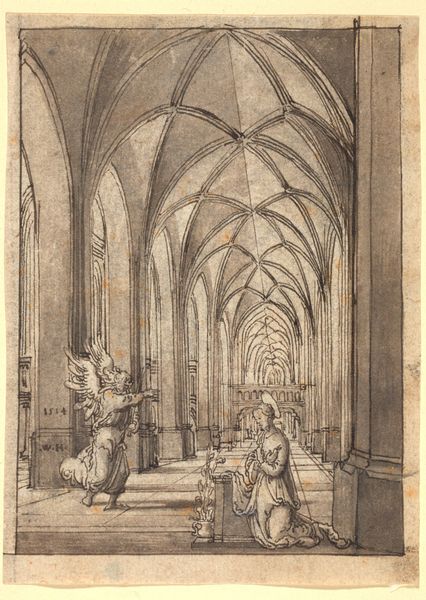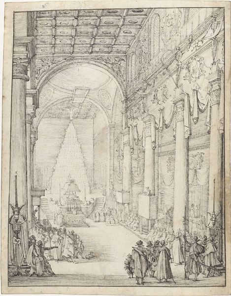 Daniel de Blieck created this drawing of the interior of the Sint-Jacobskerk in Antwerp with pen in brown and gray ink. The artist used thin lines and a light gray wash, creating a sense of spaciousness. The viewer is drawn into the church's architectural grandeur, its high vaulted ceilings, and towering columns. De Blieck was a master of architectural renderings. Here, he emphasizes the structure and form of the church, reducing the figures to mere elements within the design. His composition balances the linear precision of the architectural details with the dynamic arrangement of the figures on the ground. Note that De Blieck’s treatment of space involves both careful perspective and subtle distortions. The drawing invites us to consider the church not only as a place of worship but also as a complex interplay of lines, forms, and spatial relationships. It is a detailed construction, inviting reflection on the interplay between art, space, and society.