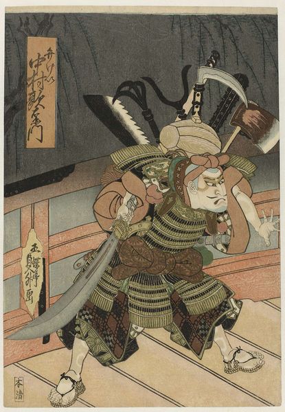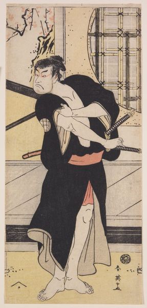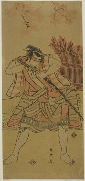 Curator: What a dynamic image! The energy practically leaps off the paper. Editor: This is a woodblock print by Katsukawa Shun'ei, an artist active in the late 18th and early 19th centuries. It depicts the actor Ichikawa Komazo II in a Sukeroku play. Curator: I'm immediately drawn to the way gender is performed here. The actor's stance, his intense gaze, it's a fascinating study in masculinity and theatricality. Editor: Ukiyo-e prints like these were hugely popular, offering a window into the floating world of kabuki theatre and celebrity culture. They were a powerful force in shaping public perceptions. Curator: Yes, and considering the context of Edo society, where social roles were so strictly defined, these prints offered a space for exploring alternative identities and expressions. It makes you wonder about the audiences consuming these images. Editor: Absolutely. This print provides insight into the cultural values surrounding art, theatre, and the representation of gender roles during the Edo period. Curator: It gives us so much to consider about that time. Editor: Indeed.