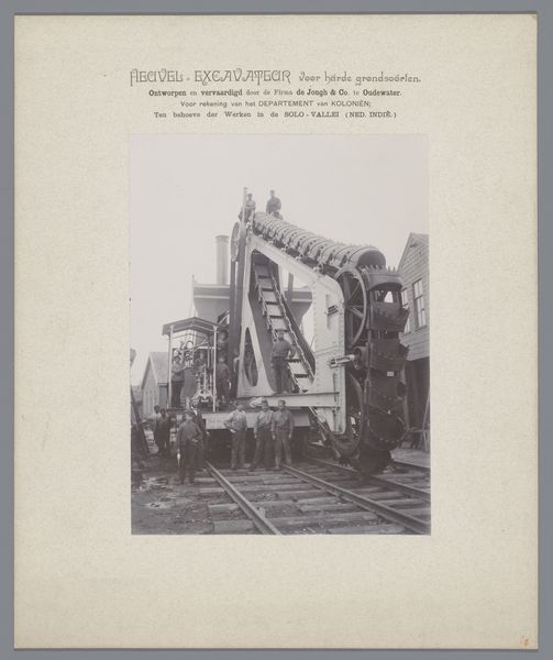 Editor: Here we have an intriguing gelatin-silver print from 1930, "Ampasstookinrichting," by an anonymous photographer, found in the Rijksmuseum collection. It portrays a large, metallic machine with the stark angles so popular during modernism, with some factory worker standing at its side. Its almost surreal industrial presence leaves me wondering about the broader story of labour it represents. How would you interpret its historical significance? Curator: That's a great question. Looking at this image, I see a confluence of factors shaping early 20th-century society. This isn't just a picture of a machine, but a document reflecting the increasing mechanization of labour, in factories, particularly concerning dangerous elements, like ampas, waste products. Do you notice how the signage in the foreground lists "S.F.Petardekan"? This is probably from a time before more controlled industry practices. The artist remains anonymous perhaps reflecting society's view of laborers at that time. Editor: That's insightful! The anonymity really drives home that point about societal views and the shift towards mechanization, prioritizing production over individual recognition. Curator: Precisely. The visual language also plays a crucial role. The stark, almost sterile aesthetic and emphasis on functionality also highlights the relationship with modernist principles but also serves to dehumanize labor and exalt machinery. How do you think viewers, then and now, might perceive this dynamic? Editor: I see what you mean. Then, I wonder if it felt progressive and a little cold. Today, though, knowing what we do about labour exploitation and worker's rights, it feels critical, even unsettling. It prompts us to reflect on both technological advancement and its human cost. Curator: Exactly. This seemingly simple image offers a complex dialogue between industrial progress, social anonymity, and the politics embedded in visual representation. What are your take-aways about labor's imagery and the context around it? Editor: I see that images, even simple records like these, carry important, but easily overlooked commentary of the society and times it exists in. Thank you. Curator: Thank you, this new view, emphasizing context over appearance has really informed the way that I am going to view archive works in the future.