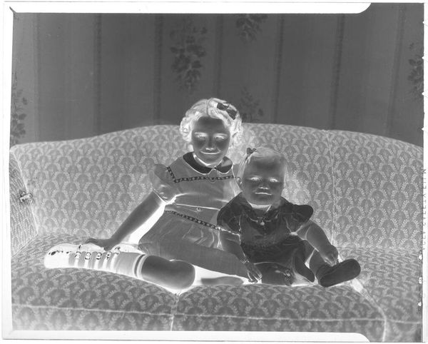 Curator: This photographic work, simply called "Untitled (little boy with baby)," comes to us from Lucian and Mary Brown. Editor: It strikes me immediately—the stark tonal inversions create such an unsettling mood, almost spectral. Curator: Indeed. Without dating information, we can only interpret its potential cultural context—the children, seemingly subjects of the camera’s gaze, reflect a time when domestic portraiture began to flourish. Editor: Note how the composition guides the eye; the background drapes and the horizontal plane draw your gaze towards the children, despite the photographic inversion. Curator: The Browns invite us to consider childhood and familial ties within the socio-political landscape of their era. Editor: I appreciate how the formal qualities enhance the emotional ambiguity. Curator: A fascinating look at family, filtered through the lens of its time. Editor: A haunting image, indeed, made more so by its very construction.