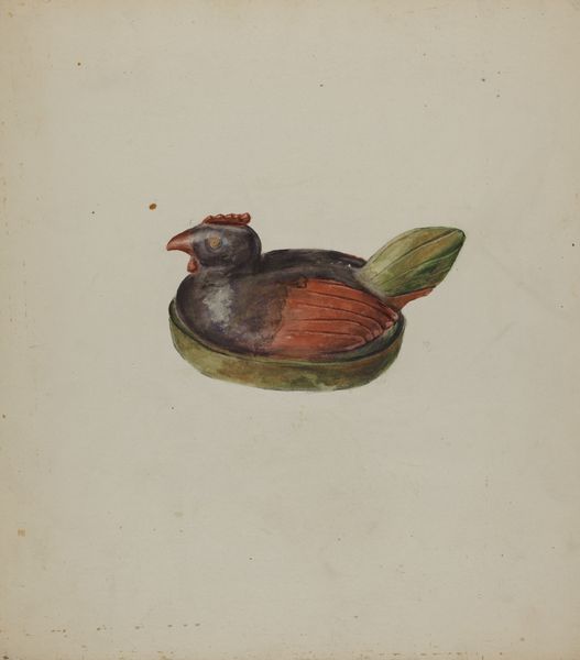 Editor: Here we have Charles Garjian’s “Pa. German Toy Bird,” a watercolor drawing dating from the late 1930s to early 1940s. It feels almost… nostalgic, like a memory of a simpler time. What strikes you about this piece? Curator: What immediately comes to mind is the historical context of folk art traditions, especially within the Pennsylvania German community. Consider the timing – this was produced during the Depression era. Does the image of a handcrafted toy bird represent a yearning for simpler, pre-industrial values, a rejection of mass production and a return to community-based craftsmanship? Editor: That’s a great point! It almost feels like a political statement, disguised as something quaint. The vibrant colours used to decorate the bird also make it feel deliberately un-industrial. Curator: Exactly! The artist is choosing to represent a very specific object, a Pa. German toy. Why that object? What are they saying about cultural preservation and the value of regional traditions during a time of significant social and economic upheaval? It also feels like the object has been curated almost like a display. Editor: That’s a whole new layer to it that I hadn’t considered! It makes me wonder, was Garjian part of that community or an outsider looking in? Curator: That's a key question to research. If Garjian was an outsider, his rendering could be interpreted as an appropriation or idealization. If he was an insider, it might signify a deeply personal connection and commitment to preserving his cultural heritage. Both questions would require more research, of course. Editor: Wow, I'm definitely seeing this drawing in a completely new light. I was too focused on its aesthetic appeal initially. Curator: It's a reminder that even seemingly simple artworks can hold complex layers of social and historical meaning. We must always remember that art has always been embedded in its cultural background, a voice in an endless social conversation.