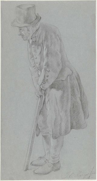 Curator: This is Mariano Fortuny Marsal’s “Young Man with a Sword," housed here at the Harvard Art Museums. It’s a pencil sketch, about 11 by 8 inches. Editor: It's so raw! It gives the impression of someone caught between worlds, the almost finished figure and the visible lines. Curator: Absolutely. You get the sense of a costume study, perhaps for a larger painting. The kilt is particularly detailed. Editor: A kilt speaks to specific labor practices, doesn't it? The weaving, the dyeing, the tailoring. Curator: Indeed. Fortuny was fascinated with historical details, but also, I think, with the romance of bygone eras. It feels incomplete, yet deeply evocative. Editor: Fortuny captures the material reality of a garment, the weight and drape of the clothing. I see how social status and identity are woven into the very fabric of existence.