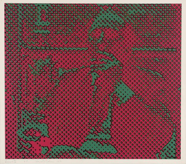 Curator: Harold Cohen's "Richard I" offers a fascinating case study in the deconstruction of portraiture. Editor: The sharp yellows and purples give an unsettling pop aesthetic—it feels almost digitized, as if something is being processed or breaking down. Curator: Precisely. The Ben-Day dots create a field of visual information, but do they clarify or obscure the subject? Is it representation or abstraction? Editor: Given the subject, could this be an exploration of power diluted by the very systems that uphold it? The dots, like data points, reducing a king to an algorithm. Curator: A compelling reading! The materiality and its form could be a commentary on modern media's impact on historical memory. Editor: Indeed. It's a dialogue between past iconography and the digital present. Curator: A fitting endnote on our consideration of Cohen's work.