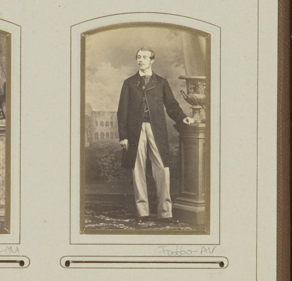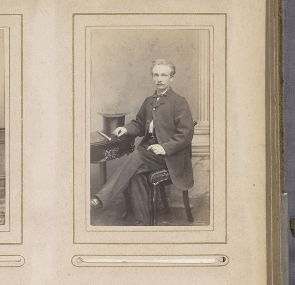 Editor: Here we have Frederik Kayser's "Portrait of a Boy Standing by a Table," an albumen print from between 1860 and 1890, housed at the Rijksmuseum. He looks quite formal and almost a bit sad, standing there in his suit. What do you see when you look at this photograph? Curator: It's a seemingly simple portrait, but it’s ripe with considerations of class, gender, and the construction of identity. Photography in the mid-19th century was becoming more accessible, yet a formal portrait like this still signified a certain social standing. Consider the boy's clothing: the suit, the carefully arranged scarf. These details speak to the performance of bourgeois masculinity. What narratives might be embedded here? Editor: So, it's not just a picture of a boy, but a statement about his position in society? It’s interesting how a photograph, supposedly capturing reality, can be so carefully staged. Curator: Precisely. And staged for a particular audience. Think about the absent father. Is this image meant to display that this boy is able to adhere to this system? The way he clutches the table, the background—everything contributes to this constructed image. How do you think a contemporary audience might react to this controlled presentation? Editor: I guess we’re so used to seeing casual snapshots that the formality feels very deliberate, maybe even a bit alienating. Curator: It prompts us to question the nature of portraiture itself. Whose stories are told, and how? What power dynamics are at play in representing an individual, especially a young one, in a specific light? It also reveals who had access to these resources, solidifying particular social roles through images such as this. Editor: That definitely gives me a lot to think about. I'll never look at old portraits the same way again. Curator: That's the power of contextualizing art. It challenges us to see beyond the surface and unpack the narratives embedded within.