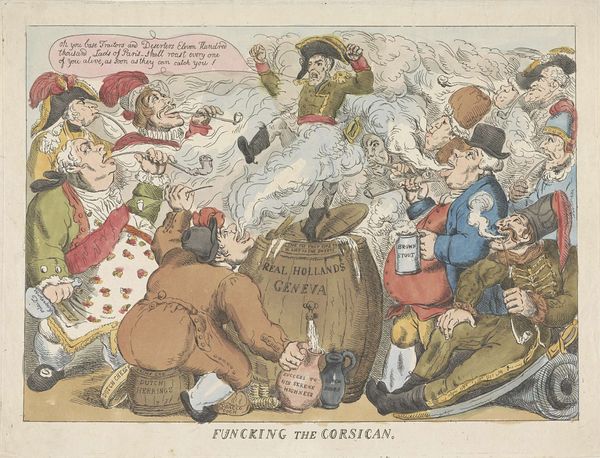 This hand-coloured etching, "Allied Powers Un-booting Egalite", was created by James Gillray around 1799. Immediately, we are struck by a composition of dynamic struggle. The figures are arranged in a chaotic yet purposeful manner. Note how Gillray uses caricature to amplify his political message. Napoleon, at the center, is the target of ridicule. He is being attacked by a coalition of European powers, each rendered with specific national symbols: the Russian bear, the Ottoman Turk, and the British sailor. Italy is literally torn apart, a symbolic gesture of the territorial disputes of the time. The artist uses sharp lines to define the figures. The texture is achieved through hatching and cross-hatching, creating a sense of depth and intensity. This print destabilizes the image of Napoleon. Gillray employs visual satire to undermine Napoleon's authority. The term 'Egalite' is subverted.
