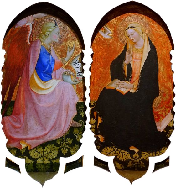 Editor: Here we have Álvaro Pires de Évora's "Annunciation Diptych," created around 1420, using tempera on panel. I find the formality of the setting quite striking, almost theatrical. How should we consider the significance of its materials? Curator: A key starting point is the actual process of creation. Tempera wasn't a quick medium; it required careful layering. Consider the lapis lazuli, ground to create ultramarine – a pigment historically as valuable as gold. What does that inherent material value contribute to the narrative of divine importance? Editor: So the labor and inherent worth of the materials are as vital to the "annunciation" as the figures themselves? Curator: Precisely. These expensive pigments weren't chosen arbitrarily. It highlights the economic power behind the commission, possibly signaling the patron's status, and also directs focus to the divine narrative represented. Editor: That reframes how I view it entirely! Is there also any specific link between these panels' materiality and the rise of the Italian Renaissance style? Curator: The materials employed tie into the artistic climate, including their acquisition and treatment, alongside the cultural investment into the religious scene portrayed. Tempera panels, by this stage, represent both continuity with established traditions, and experimentation towards an increased visual naturalism, facilitated in time through changing relationships with pigment and process. Editor: It's amazing to think about how materials, production, and power converge in these panels, it gives them a new significance. Curator: Exactly! Examining the physical components and the circumstances of creation makes it clear that art’s message transcends mere imagery; its worth and intent are molded by cultural values.
