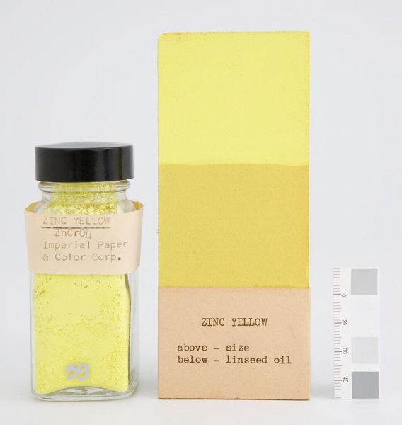 Editor: Here we have "Naples Yellow," created by J.D. Pemberthy. It's, well, a jar of pigment and a painted card. I find it interesting that it's a manufactured color sample. What do you make of this? Curator: It’s like a little alchemical secret, isn’t it? To think that this specific yellow, this "Naples Yellow," was so coveted that it became a commodity. I imagine artists carefully grinding and mixing it, searching for that perfect sun-kissed hue. Editor: So, it's not just yellow; it's a specific, almost magical yellow. Curator: Exactly! It’s a story of color, commerce, and the artist’s eternal quest for capturing the world around them. It makes you wonder what stories are hidden in other colours!