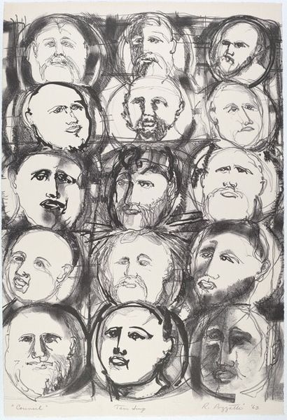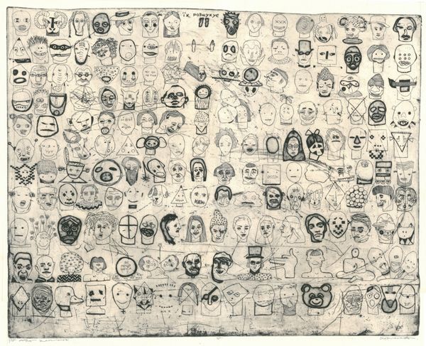 Curator: Here we have a piece titled "Untitled," created in 2017 by EtchingRoom1, composed using pencil on paper. Editor: It's immediately unsettling. All those faces packed together, some with multiple eyes. It evokes a sense of unease, almost like a fever dream. The monochromatic palette adds to the starkness. Curator: I think that unease stems from the artist’s engagement with the contemporary understanding of identity and anonymity in large social groups. The dense concentration of portraits references both individual and collective states, prompting a re-evaluation of our relationship to the masses. Editor: Precisely, especially with some faces appearing vacant or distorted, heightening a collective anxiety of losing individuality. There's a commentary here on visibility, perhaps even surveillance and the feeling of being watched or homogenized within society. Curator: The use of simple materials, pencil and paper, also speaks to its accessibility. It's a medium readily available, democratizing artistic expression. It creates a sense of urgency through the fast, crude style. The artist doesn’t appear to make calculated aesthetic moves toward beautification, as they seem uninterested in commercial aspirations. Editor: Right, the crudeness feels intentional, cutting through polished pretenses. Look how some have more care rendered in them, whilst others feel gestural; it feels immediate like reportage from an insider speaking truth to power about the crowd’s fears. In this sense, the composition, through the individual features and style, evokes the powerful emotional resonance of societal anxieties. Curator: So, beyond being a mere artistic statement, "Untitled" operates as a social document, chronicling sentiments prevalent in the early 21st century, such as fear and hyper-awareness in times of political tension. Editor: Yes, it prompts critical introspection—making it difficult to ignore the complexities of modern society’s effects on individuals within larger socio-political movements. Curator: This piece encourages us to look critically at those effects, fostering dialogue surrounding individuality and anxiety in the information age. Editor: Agreed. This piece invites the viewers to grapple with difficult themes around community and social experience, leaving one thoughtful, challenged, and certainly not indifferent.