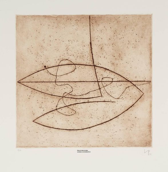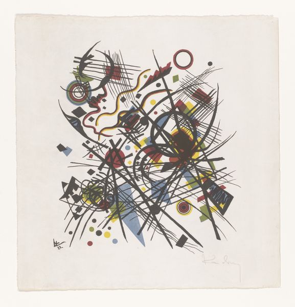 Editor: This is Victor Pasmore's "Linear Motif in Three Movements." I am struck by how the lines create a sense of playful balance, like a visual puzzle. What can you tell me about its historical context? Curator: Pasmore shifted to abstraction in the 1940s. Looking at this print, consider the post-war reconstruction era. Artists aimed to create new visual languages. Do you see echoes of architectural planning here, a kind of utopian vision embedded in the geometric forms? Editor: I hadn't thought about it that way, but I do see the connections to city planning, with defined zones connected by flowing lines. Curator: The limited color palette also reflects the economic constraints and material sensibilities of the time. These aren't just aesthetic choices; they are reflections of the socio-political landscape. Editor: That makes me appreciate the print even more, seeing it as a response to its time. Curator: Exactly! And it reminds us that art is always in dialogue with its context.