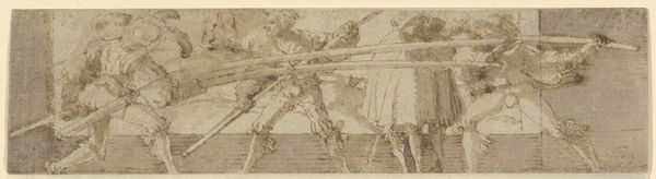 Curator: This is Jacques Callot’s "Standard Bearer," an etching measuring a mere 5.7 by 8.3 centimeters. It’s part of the Harvard Art Museums' collection, offering a glimpse into military life. Editor: My immediate thought? Pure, unadulterated swagger. Look at that figure, defying chaos with such bold confidence! The flag practically dances. Curator: Absolutely. Callot’s etching technique allows for incredibly detailed depictions of both the central figure and the teeming battle scene behind him. His focus on the material conditions of warfare, from clothing to weaponry, becomes apparent even at this scale. Editor: It's like a tiny, potent storm of bravado. The lines crackle with energy. Curator: Indeed. One can see the interplay between the printmaking processes and the social narrative it conveys. It’s not just about aesthetic representation; it’s also about the means of production, circulation, and consumption of such imagery. Editor: Right! This little battle cry just makes you want to grab a flag and lead the charge! Curator: Precisely. These details emphasize the historical and material contexts in which these images were created and consumed. Editor: This work is so powerful! It is something I'll need to consider when examining additional artwork!
