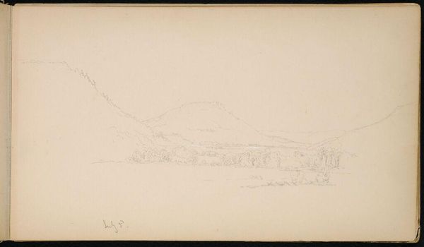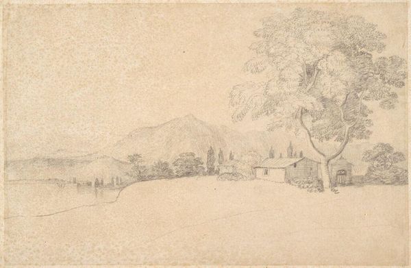 Curator: Wilhelm von Kobell's drawing, "Near Schlehdorf," presents us with a quiet, almost ghostly scene. The Harvard Art Museums hold this particular rendering. Editor: It evokes a sense of solitude, doesn't it? The muted tones and sparse lines create a dreamlike atmosphere. Curator: Certainly. Kobell, working in the late 18th and early 19th centuries, captured landscapes that often reflected the social and political climate of his time. Consider the rise of Romanticism. Editor: And how the rise of Romanticism can be seen as a response to the Enlightenment's emphasis on reason, with artists turning to nature as a source of emotional and spiritual renewal. I find myself wondering about the figures, they appear as if they are being consumed by the landscape. Curator: The scale and detail given to the environment certainly overwhelm the characters. One interpretation could be the insignificance of humankind when facing nature. Editor: It's also worth thinking about how the lack of color contributes. By using graphite, Kobell avoids any sentimentality, presenting the landscape as a stark, perhaps even critical, observation of the world. Curator: Indeed. The drawing invites us to reflect on the interplay between humanity, the natural world, and the art historical contexts that shape our understanding. Editor: I'm leaving with a stronger sense of the power of understatement.