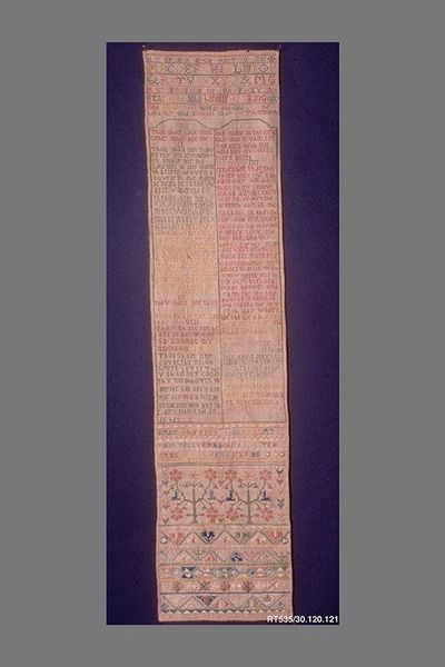 This Embroidered Sampler was created by Betsy P. Cross in the 1800s, using needlework on linen. Samplers such as this one were commonly produced in both Europe and America, functioning as demonstrations of skill and accomplishments for young women. The sampler’s didactic function reflects the social expectations of women at the time. Skillful needlework was a marker of gentility, indicating one’s social standing and suitability for marriage. Its presence in the Met is interesting in that it elevates a domestic craft object to the level of art. The museum, by exhibiting this work, makes a statement about the artistic merit and cultural significance of women’s traditional work. Studying objects like this requires us to look at period instruction manuals, women's diaries, and social histories to understand their original context. The meaning and value we ascribe to art objects are often contingent on social and institutional practices.
