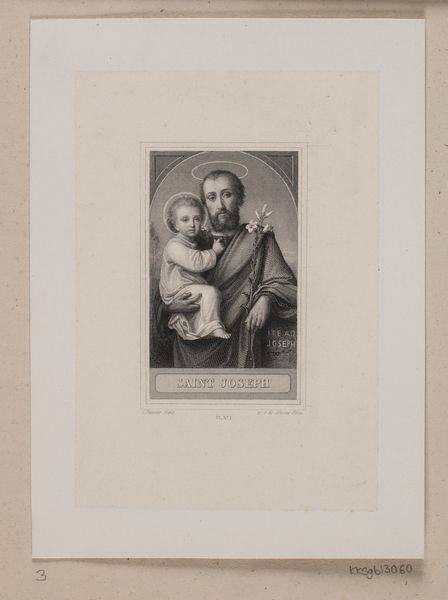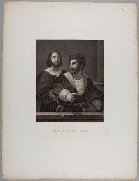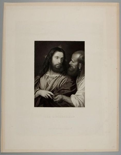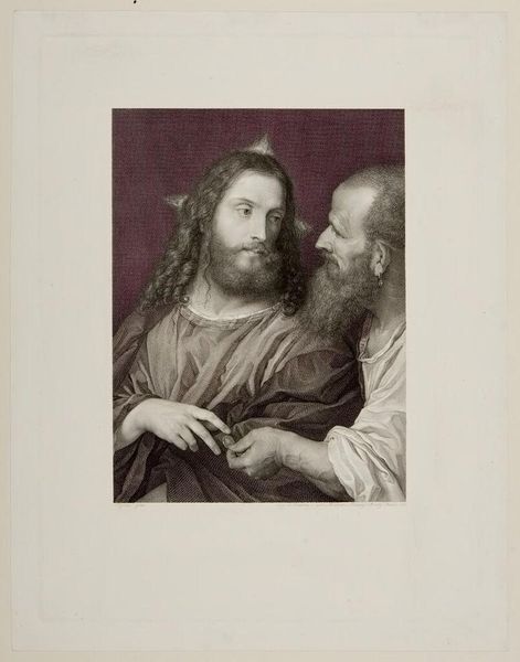 Editor: This is "Tribute Money," by Johann Heinrich Friedr. Ludwig Knolle. It depicts two figures looking at a coin, rendered in what looks like engraving. What strikes you most about the composition? Curator: The stark contrast between the light falling on Christ's face and the other figure draws the eye immediately. Consider the interplay of gazes – Christ's directed outward, his companion's inward – constructing a narrative of conflicting perspectives solely through formal means. Editor: That's a fascinating point. Can the use of color enhance this reading? Curator: Note the muted palette. How does this aesthetic choice contribute to the image's overall message and engagement with form? Editor: I see now how the image creates meaning through the interplay of light, gaze, and color! Curator: Precisely, underscoring how formal analysis can reveal layers of meaning.