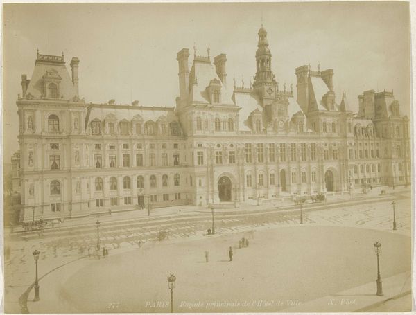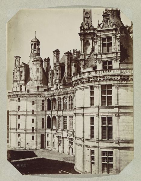 Curator: Here we have a photograph from 1904, "Gezicht op het kasteel van Chambord", held here at the Rijksmuseum. What strikes you initially about it? Editor: The overwhelming density, all those towers and turrets, a gothic fever dream built in stone! The light emphasizes texture and materiality so strongly, almost obliterating the structure behind. It feels less like a regal residence and more like a factory producing fairy tales. Curator: Interesting point. Chambord was commissioned by King François I in the 16th century, reflecting a significant shift in power dynamics and royal iconography. Photography in 1904 had evolved, allowing a detailed capture of architectural majesty while simultaneously democratizing access to these formerly exclusive sites. How do you think this medium shapes the interpretation? Editor: I’m intrigued by how photography itself becomes a manufacturing process. Light, chemistry, labor in development and printing; the image is an artifact of specific industrial practices and a means of mass dissemination. And given its inherent indexicality, the photograph seems to emphasize the castle's concrete presence. Curator: Absolutely. It brings the stone, the scale, and the detail into the domestic sphere in a new way. I find it compelling how photography enables and frames a dialogue between royal spectacle and modern viewers. Does it encourage deference or allow for new critical viewpoints on national heritage? Editor: I think it definitely facilitates new interpretations. This isn’t just a record; it is about circulation, reception, the making and remaking of public memory. And considering how the image might have reached broader audiences—perhaps via postcards or printed reproductions—we confront an intriguing interplay between accessibility and consumption. Curator: Indeed. Considering the scale of Chambord, one wonders about the vast amount of materials used and labor expended. Each element tells a story of societal infrastructure, craftsmanship, and economic might. Editor: Precisely, it all boils down to production and the forces behind image distribution. The way photography shapes how we relate to such grand edifices speaks volumes about the nature of accessible information in a modernizing world. Curator: This photograph certainly invites a discussion on various perspectives concerning heritage, democratization, and representational techniques, making our experience of the image truly interesting. Editor: I'm leaving with an even greater appreciation for how technological advancement mediates history. The printmaking truly gives an uncanny view, doesn't it?