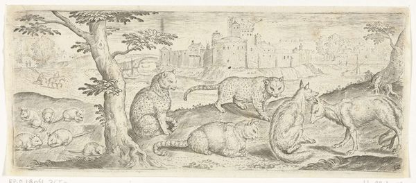 Curator: This engraving, dating back to 1583, is titled *Ratten, katten en vossen in een landschap*, which translates to "Rats, Cats, and Foxes in a Landscape." Marcus Gheeraerts the Elder is credited as its creator. It currently resides in the Rijksmuseum collection. Editor: My first impression is one of starkness and artificiality. The way the light is rendered creates these almost metallic looking figures, despite ostensibly depicting animals in a pastoral setting. It feels very deliberately constructed, unsettling even. Curator: Precisely. The use of engraving allows for incredible detail and precise lines. Look at the textural differentiation – the meticulously rendered fur of the animals contrasts with the smooth expanse of the architectural backdrop. Note also the Mannerist tendencies present, the emphasis on artifice over naturalism. Editor: Yes, and I find myself drawn to the process involved in creating an image like this. The physicality of etching lines into a metal plate, the labor intensive printing process itself, creates an object of art rooted deeply in the tangible world, however stylized the figures are. Curator: Observe the symbolic interplay. The rats, emblems of vulnerability, juxtaposed with predatory cats and foxes creates a miniature stage for natural conflict. The backdrop, possibly representing a manorial estate, reminds us of imposed order and territory. Editor: And those human elements, that tiny rider off to the left—they represent something distinct too; it is almost as if that solitary traveler acknowledges an imbalance, that humans are merely accessories while these imagined scenarios of class hierarchies within species take centre stage. Curator: Ultimately, Gheeraerts gives us a composition rich in semiotic resonance. By focusing on line, form and relationship the work asks profound questions about hierarchical power and existence itself. Editor: Absolutely. And thinking of Gheeraerts’ role within Antwerp's artistic community reveals its intersection with social forces impacting image creation, as engravings become crucial means for transmitting visual information amongst craft workshops across Early Modern Europe.