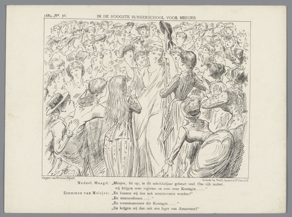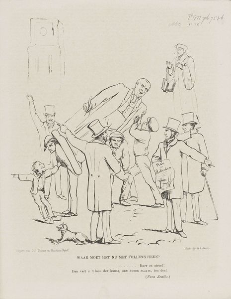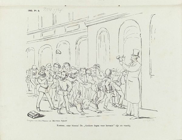 This lithograph, created by Johan Michaël Schmidt Crans in 1865, uses the graphic power of ink on paper to deliver a potent political message. The relative ease and low cost of lithography allowed for the broad distribution of satirical images like this one, commenting on Dutch university life. The stark black lines and the absence of color forces us to focus on the narrative being conveyed: the artist is critiquing the state of academia. We see figures recoiling in horror, and what appears to be a representation of university education draped lifelessly in a chair. This directness is enabled by the very nature of the printmaking process itself, cutting out subtleties in favor of immediate communication. The choice of lithography speaks to a wider social context: the rise of mass media and the increasing importance of visual culture in shaping public opinion. It’s a reminder that even seemingly simple materials and processes can be powerful tools for social commentary.