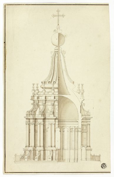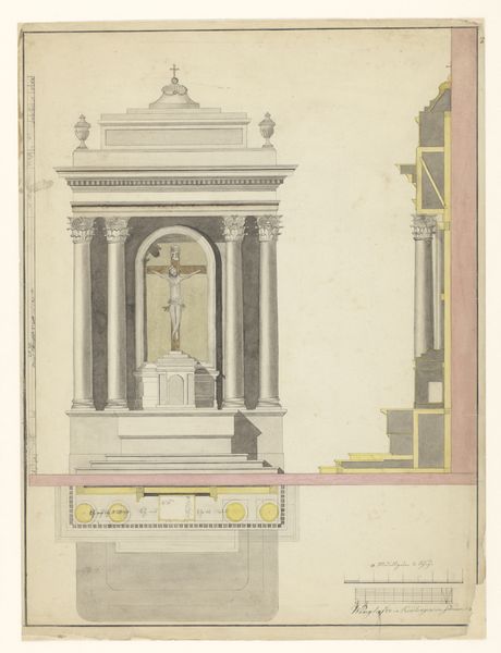 Curator: Right now we're looking at "Plan and Elevation of an Entrance" created in 1793 by Giovanni Battista Galliani. It’s currently housed at the Metropolitan Museum of Art. It is a drawing combining print, watercolor, and architecture. Editor: First thought? This feels so…dreamy. Like a faded memory of a grand entrance that only existed in someone’s mind. There’s such meticulous detail, yet the colors give it a sort of ephemeral quality. It is neoclassical without any harshness. Curator: Precisely! Think about the context of Neoclassicism, its rigid rules… Galliani’s giving us the skeleton, but he's also adding flesh with the watercolour, softening the stone cold perfection. It’s more suggestive of power, perhaps, than overtly declaring it. What's interesting is that Galliani created it during a time when revolutionary fervor started to affect views towards architectural spaces that communicated privilege and hierarchy. Editor: Almost as if he is showing us how to make a palace more friendly and gentle! The use of shading and shadows isn't about depicting reality as much as it's about suggesting mood. Curator: And think about how this piece was received. These architectural fantasies, as they were often called, weren’t commissioned structures—rather they explored a tension: between revolutionary ideology, and a more gentle take on how civic structures and even domestic spaces might operate in the future. Editor: I find it interesting how the plan at the bottom anchors this grand design. It’s a reminder that all these glorious visions need a solid base, a material foundation. Otherwise, they are just…thoughts floating away, aren’t they? It makes you wonder about accessibility; who exactly is invited to pass through this gate? Curator: An essential question. Galliani offers, not necessarily accessibility for all, but perhaps for a privileged few who can interpret architectural ideals through both intellect and aesthetics, even envisioning more socially equitable alternatives. Editor: So, in the end, are we looking at the dream of a building, or the ghost of one? A gate to progress, or just another pretty wall? Curator: Perhaps a bit of both, eternally suspended in potential, reflecting shifting sociopolitical landscapes across centuries of reception.