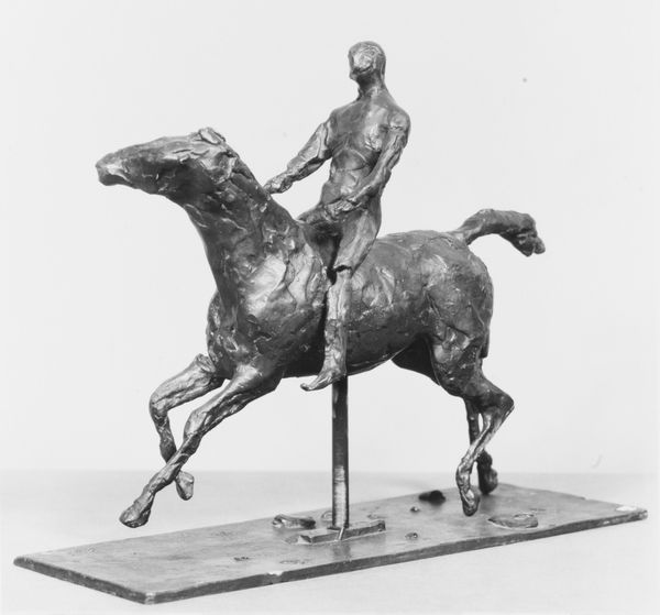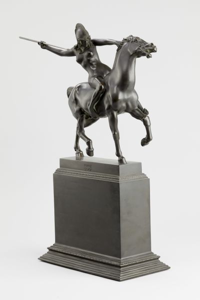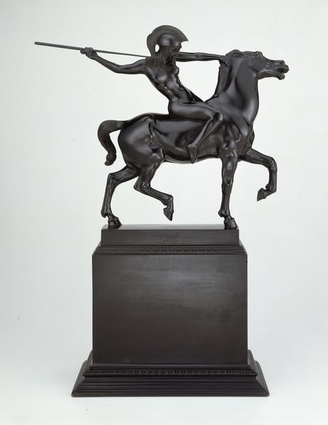 Curator: Here we have Giambologna’s "The Centaur Nessus and Deianeira," a bronze relief thought to be cast sometime between 1544 and 1608. It’s a whirlwind of emotion and tension, don’t you think? Editor: Indeed! The figures' dynamic arrangement certainly draws the eye—an ascending, almost frenzied composition that plays across the relief surface. What is the historical context? Curator: Well, it depicts a scene from classical mythology. Nessus, the centaur, is abducting Deianeira, Hercules’ wife. See how her arm is raised in desperation, practically pleading for help? Giambologna really captures that raw fear. And that centaur's face, somewhere between grimace and determined lust. Editor: The Mannerist style is clearly at play here, evidenced through the deliberate distortion and exaggeration of anatomical forms—a signature style used for heightening the drama and emotional intensity of the narrative. How would you articulate its structure? Curator: Giambologna, cheeky genius that he was, uses the bronze to its full potential. The muscles of Nessus are so clearly defined, almost like they're flexing right at you. And that glossy finish…gives it such a vivid, almost unsettling realism, don’t you feel? It is impossible not to wince at her torment as the Centaur struggles forward on that little, crowded platform of horrors. Editor: Absolutely, and consider how the relief structure here actually flattens and accentuates the bodily entanglement. The details, such as the grimacing masks adorning the base, amplify the overall sense of grotesque violence and amplify the disquieting themes already presented above them. The formal aspects are very pronounced here and build an experience for the viewer. Curator: I keep being drawn back to the woman and to the desperation with which she has attempted to escape the depraved Centaur's grasp. As a student, you know, I attempted to translate this raw story into a drawing once; needless to say, I aged about ten years. I never looked at mythology the same way again. Editor: Precisely, an emotional investment in this artwork certainly enriches a viewer's reception; by studying its composition, forms, and inherent tensions, we begin to engage more deeply. The emotional crescendo translates into profound and lingering observation, doesn’t it? Curator: Absolutely. Art that truly challenges us stays with us, shapes us, makes us question… This relief by Giambologna serves up all of this and a healthy dose of drama, don’t you agree? Editor: Most assuredly; it will stay with me for some time!