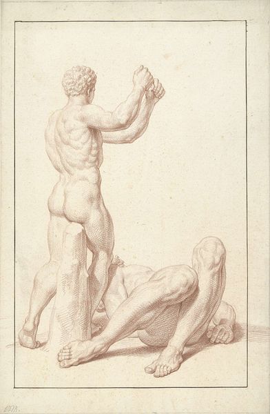 Curator: Wow, these figures are monumental, aren’t they? Immediately strikes me as wrestling with form, the agony and ecstasy of creation itself! Editor: And here we see Peter Paul Rubens in what appears to be an anatomical study. It is titled "Anatomical Studies of Three Male Figures", and features drawings using charcoal and ink on paper. Curator: Anatomical studies is putting it mildly! Look at that torsion, that almost painful striving! Do you think Rubens was obsessed with muscles or obsessed with portraying raw emotion, maybe both? Editor: The Academic art style heavily emphasized human anatomy, returning to the classical ideals that emphasized perfection. Rubens was instrumental in cementing the foundations of the Baroque, injecting that sensuous drama into the visual lexicon of the church, royalty, and the emerging bourgeoisie of Europe. It's about conveying power, isn’t it? Curator: Precisely. Though, in its initial execution, what could it mean for the artist? What’s this personal dialogue he’s exploring when alone in his studio, grappling with line and shadow? One almost wonders if the dramatic intensity of this is, paradoxically, quite personal. Look at that almost skeletal face at the top - it looks like it’s about to tell me a story. Editor: That's interesting, given that so much of Rubens' output involved painting as a business proposition, fulfilling commissions that often involved grand narratives and propaganda for the established order. Perhaps these studies also offered him a more unfettered, exploratory space, unburdened by those pressures of social expectation? Curator: An almost secret space. Free from patrons, just him and his muses, struggling. You can sense that silent battle here. Almost like seeing an athlete training for the big event; stripped down and vulnerable. It is in moments like these that these pieces transcend being a study to tell their own tales. Editor: Yes, looking closely, the raw quality of the medium heightens the physical drama, the charcoal and ink lines capturing not only the muscle structure but a sense of movement, a tension on the verge of release. Thanks for pointing out the human qualities of this piece; it really does bring the subject matter to life. Curator: Of course! Every artistic endeavor involves not just the mind and hands of an artist, but the unique interpretation and lived experience of all of us.