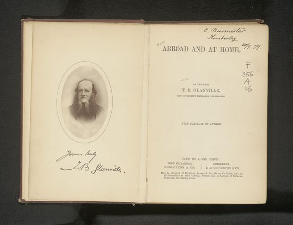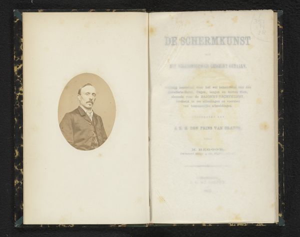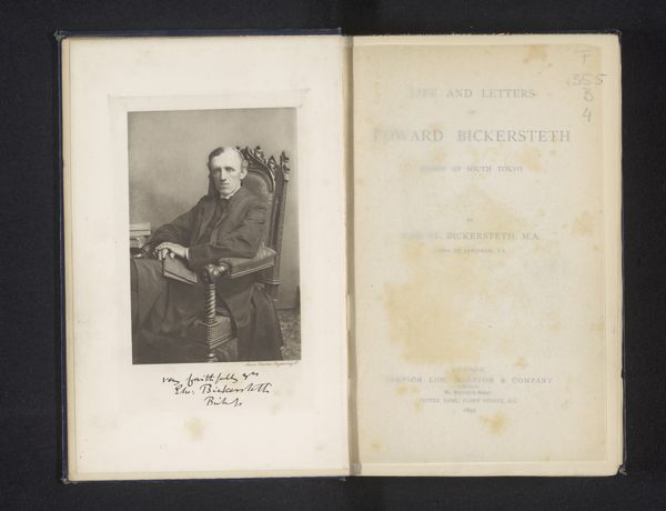 Editor: We're looking at a print titled "Reproductie van een foto van een portret van William Smith," created before 1876 by Henry Adlard. It depicts an open book; on the left page is Smith’s portrait and signature, and the right displays the book’s title, "The History and Antiquities of Morley." There's a real sense of history and formality here. How would you interpret this piece? Curator: Considering this image through a historical lens, it’s interesting how it mediates between public image and private inscription. It’s not simply a portrait, but a *reproduction* of a portrait included within his own publication. We see here the author deliberately constructing his public persona. What does the inclusion of his signature signify to you? Editor: Perhaps it's emphasizing authorship and personal investment in the work? Adding a layer of authenticity? Curator: Precisely! The photograph is reproduced, arguably making it less unique. However, the addition of a reproduction of his handwriting pushes against the reproducibility implied in print culture, in a way marking Smith as a figure whose authority could be transferred through image and text. How does that impact how you understand its function? Editor: That's insightful. The print becomes more than just a portrait; it’s about how identity and authority were constructed and circulated in 19th-century Britain, using developing print and photographic media. Curator: Indeed. The book becomes a stage on which Smith acts as the author and the character in one; that stage is, in turn, put on display to the viewer. How do institutions of history and publication reinforce personal stories? Editor: This discussion has highlighted how something as seemingly straightforward as a portrait reproduction can reveal much about societal values, like authorship, authority and class. Curator: And hopefully reminds us that all images function within a much broader network of institutional power and social meanings.