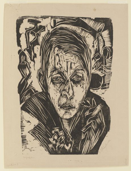 Editor: This is "Kopf Tochter Hardt," a woodcut made by Ernst Ludwig Kirchner in 1914. It's stark, black and white, and feels incredibly raw. What do you see in this piece? Curator: Immediately, the formal properties arrest my attention. Observe how the composition uses radical simplification of form. The artist employs jagged, angular lines and stark contrasts to define the subject’s features. It moves past likeness and enters a realm of pure expression. Editor: Yes, it’s the lines that strike me. They seem almost violently etched, giving the portrait an intense energy. How does the medium – the woodcut itself – play into this? Curator: The medium is crucial. The inherent nature of woodcut—requiring the removal of material to create an image—necessitates bold, reductive marks. Kirchner embraces this, creating texture and form from the very act of carving. Semiotically, these choices convey tension and emotional depth. How would you interpret the overall structure? Editor: The heavy brow and downturned gaze suggest melancholy, or perhaps defiance? The structural components really emphasize those features, adding weight to the figure’s expression. Curator: Precisely. It moves past being a simple portrait of an individual, the semiotic components blend and allow the composition as a whole to communicate a universality about introspection and feeling. Note that in contrast to the subject, the very blocky texture of the ground behind her is very expressionistic too. Editor: Looking closely now, the stark, carved aesthetic really makes this so much more than just a portrait. Curator: Indeed, by examining its intrinsic structure and materiality, we can uncover the rich complexity residing within Kirchner’s bold aesthetic decisions. The piece makes effective and concise choices within its visual vocabulary.