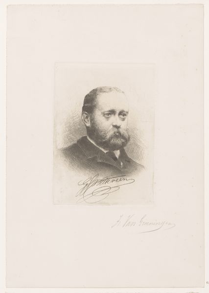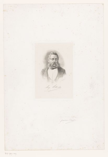 Curator: We're now looking at Léopold Flameng's "Portret van Émile-Louis Galichon," created sometime between 1841 and 1910. It's a portrait executed in pencil and engraving. Editor: It feels incredibly light, almost ethereal. The delicate lines give it an airy quality, as if it could float away at any moment. The structure, despite the softness, is still very formal. Curator: Flameng was known for his skill as an engraver and portraitist. What interests me here is the medium itself. Pencil, in the hands of a master like Flameng, allows for an incredible range of tonal variation. You see how he uses hatching and cross-hatching to build up the forms and create a sense of volume. Editor: Absolutely, and I think it speaks to a particular kind of labor—the painstaking process of building up this image, layer by layer. You can almost feel the artist's hand at work, meticulously crafting each line. And the way he renders the fabric of the coat, you get a real sense of the textile. Curator: The use of line and the implied texture work together to create not only a likeness but also a representation of status. Notice how he captures the gentleman's demeanor; the way his eyes hold the viewer, yet with a subtle reserved quality. This control, or what could be seen as rigid adherence to academic artistic practices, in constructing his likeness and form also contributes to the psychological narrative. Editor: That focus on status is precisely what I see—the materials, the process, the sheer time involved in creating something like this would have been accessible only to a select few. So even though the drawing appears 'simple,' it communicates layers of meaning concerning production, labour, and class. It reveals the dynamics and expectations associated with portraiture of that period. Curator: A compelling example of how technique and visual elements converge to express character. It gives you more than just a snapshot, you know. Editor: It certainly highlights how artmaking practices and choices, consciously and unconsciously, reflect underlying social systems.